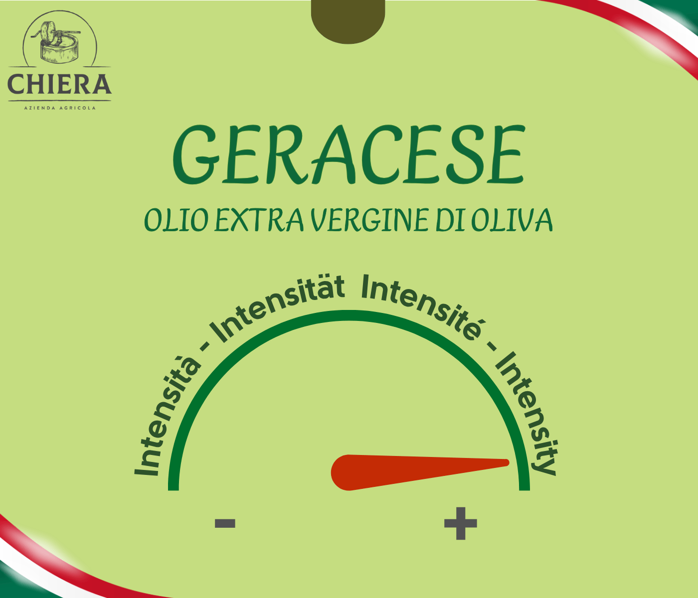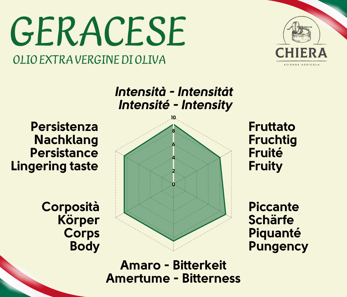 Olio extravergine di oliva 100% italiano ottenuto da olive Geracese. Dal profilo fruttato medio, con note fresche di erba e mandorla. Al gusto è molto robusto anche se rimane equilibrato e armonico, con amaro e piccante molto presenti. Ideale a crudo su verdure, pesce e piatti della cucina mediterranea.
