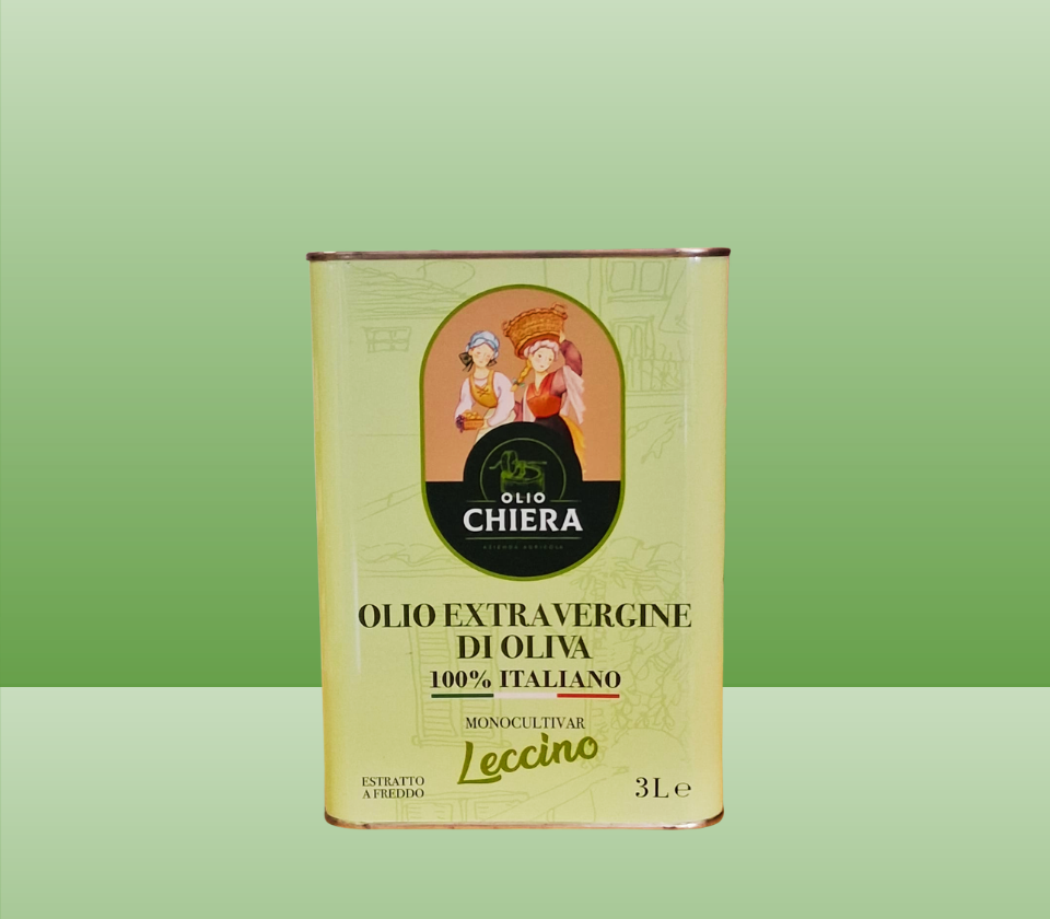 Olio Extravergine di Oliva 100% italiano ottenuto da olive Leccino coltivate in Puglia. Dal fruttato medio, con delicate note di mandorla e erbe aromatiche.