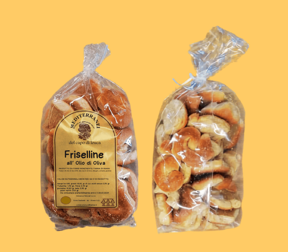 Le friselline all’olio di oliva sono un classico della tradizione del Sud Italia, semplici e genuine, preparate con ingredienti selezionati e lavorate con cura per ottenere la giusta croccantezza.