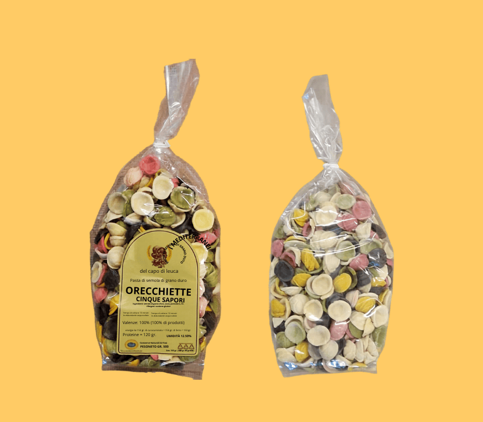 Orecchiette di semola di grano duro a 5 sapori: pomodoro, barbabietola, spinaci, curcuma e nero di seppia. Un mix unico di colori e gusto per piatti originali.
