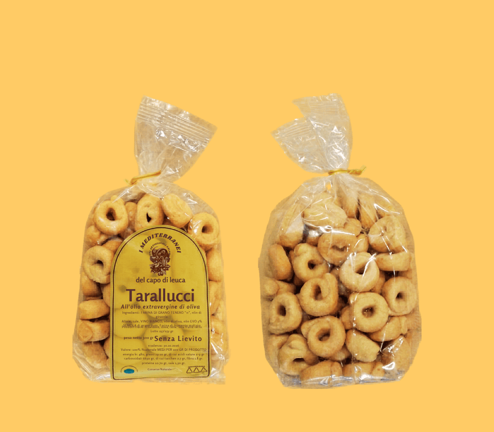 I tarallucci all’olio extravergine di oliva sono un simbolo della tradizione pugliese, realizzati con ingredienti semplici e lavorati con cura per ottenere la tipica consistenza croccante.